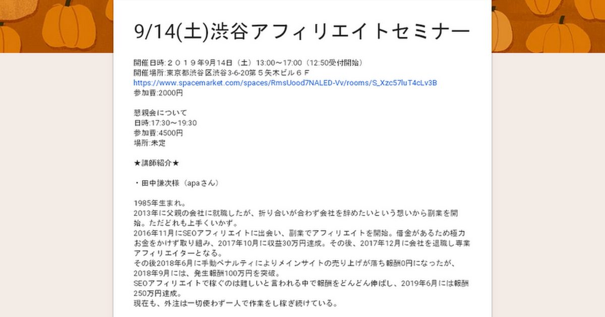 開催日時:2019年9月14日(土)13:00〜17:00(12:50受付開始)開催場所:東京都渋谷区渋谷3-6-20第5矢木ビル6F参加費:2000円懇親会について日時:17:30〜19:30参加費:4500円場所:未定★講師紹介★・田中...